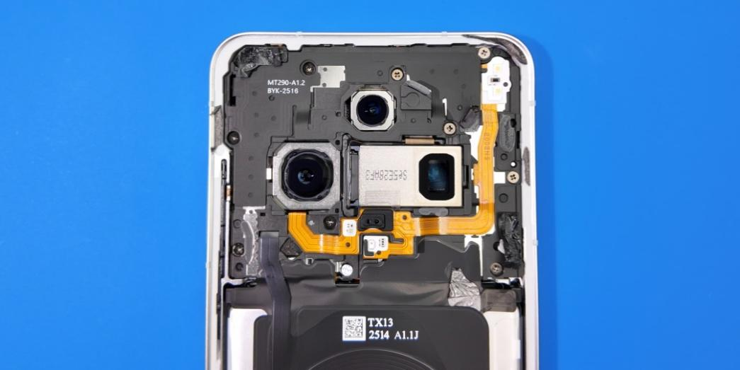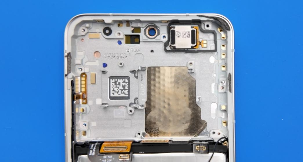 左侧上下有两块金属导电泡棉对应降噪麦克风。方形镂空对应前置环境光等感应器,内部有缓冲泡棉。扬声器区域:有不规则泡棉,缓冲和提升音质,防止漏音。左侧中间4个触点对应电源键和音量键。主摄和长焦镜头有CNC限位角固定。长焦镜头及主板核心区下方有大面积镂空,露出VC均热板。