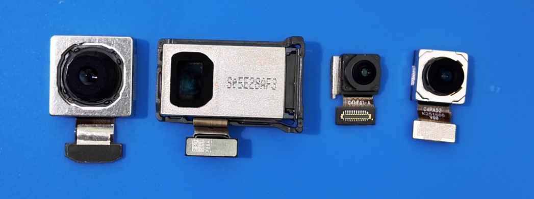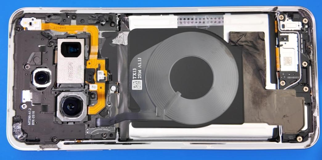 主摄周围有NFC线圈,右上角双LED闪光灯,中间黑色方块是环境光传感器。长焦镜头下方有激光对焦和Flicker防闪烁传感器(激光对焦外有橡胶套)。三颗摄像头都有金属防滚架,盖板有限位框固定。左侧黄色FPC对应电源键,左下黑色FPC对应无线充电线圈,右下白色同轴线连接副板。电池仓有大块散热膜,覆盖无线充电线圈、主板和底部扬声器。