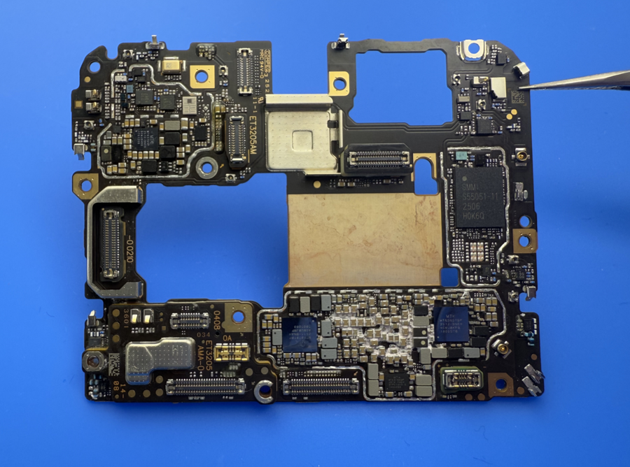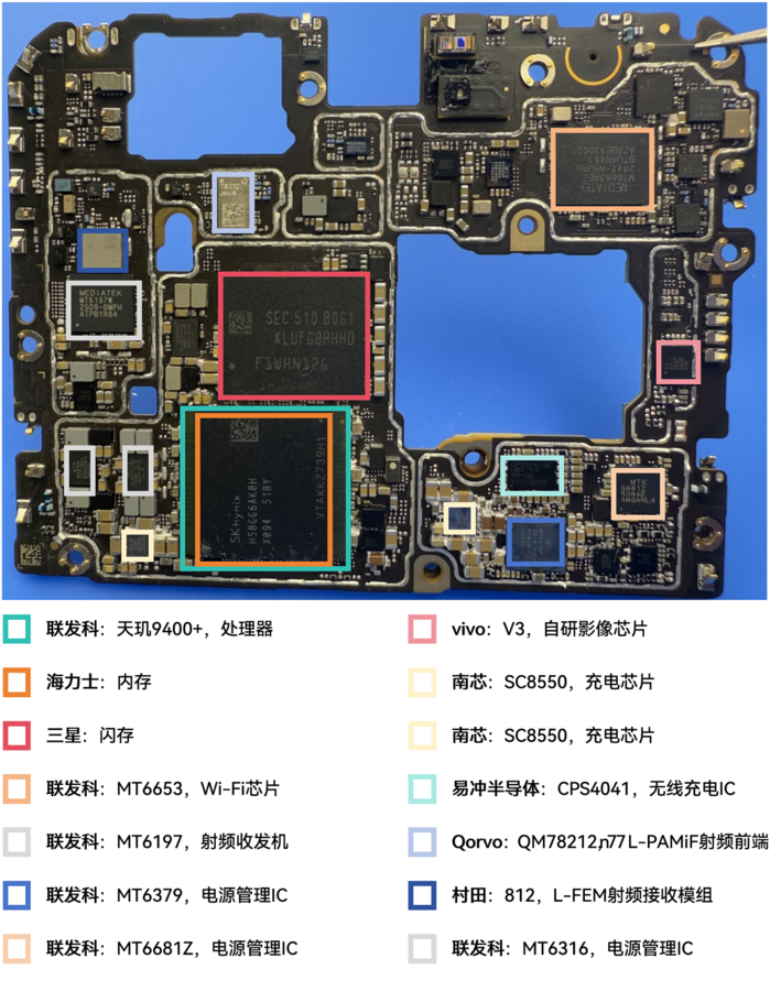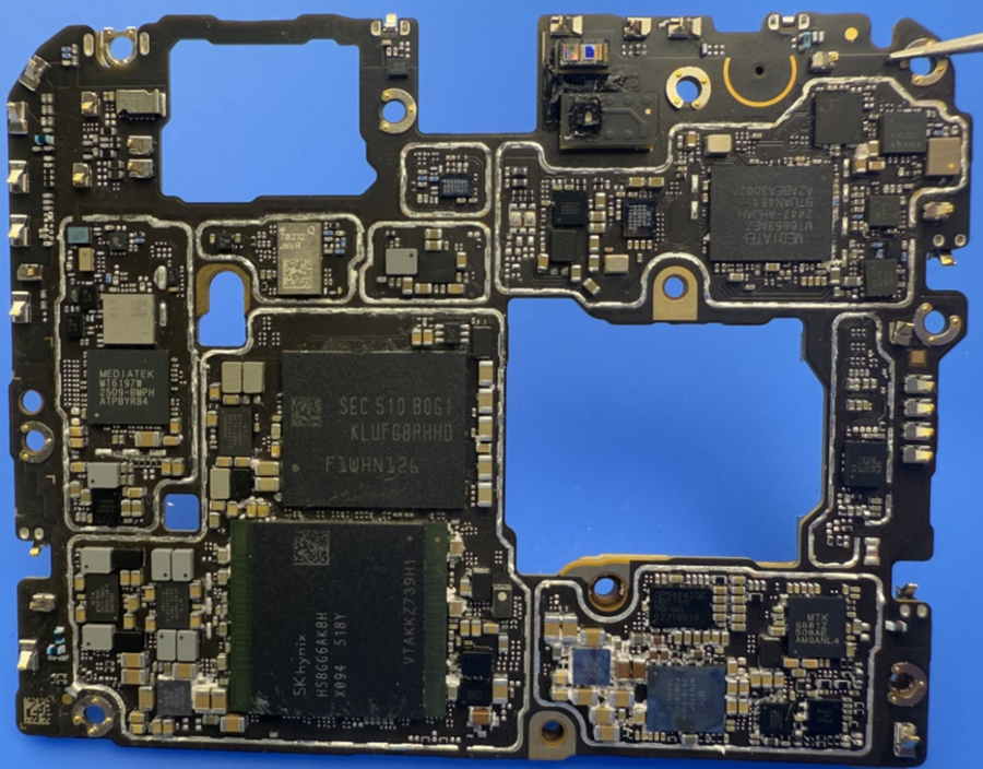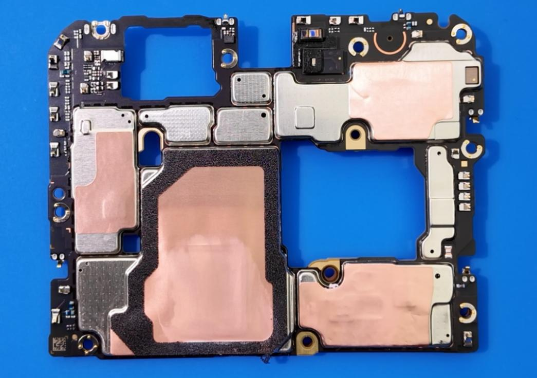 撕开所有铜箔,拆开屏蔽罩,清理散热材料,我们就能清晰的看到这款手机使用的绝大部分芯片: