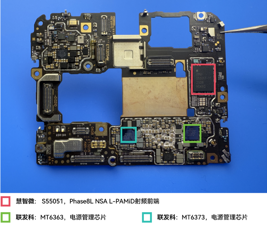 其中国产芯片中最大的一颗是慧智微提供的是S55051 Phase8L NSA L-PAMiD射频前端模组芯片,这是一颗覆盖Sub-3GHz全频段的高集成射频前端模组芯片,也是拆机中第一次见到国产厂商可以提供类似的芯片。