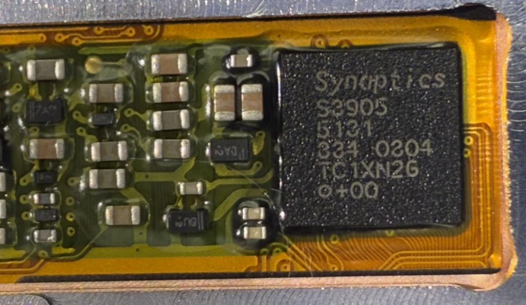 指纹模组在屏幕和中框之间,X200s采用的是超薄屏幕指纹方案。框架上有一处镂空,露出的芯片就是触控IC,它来自新思科技,型号为S3905。